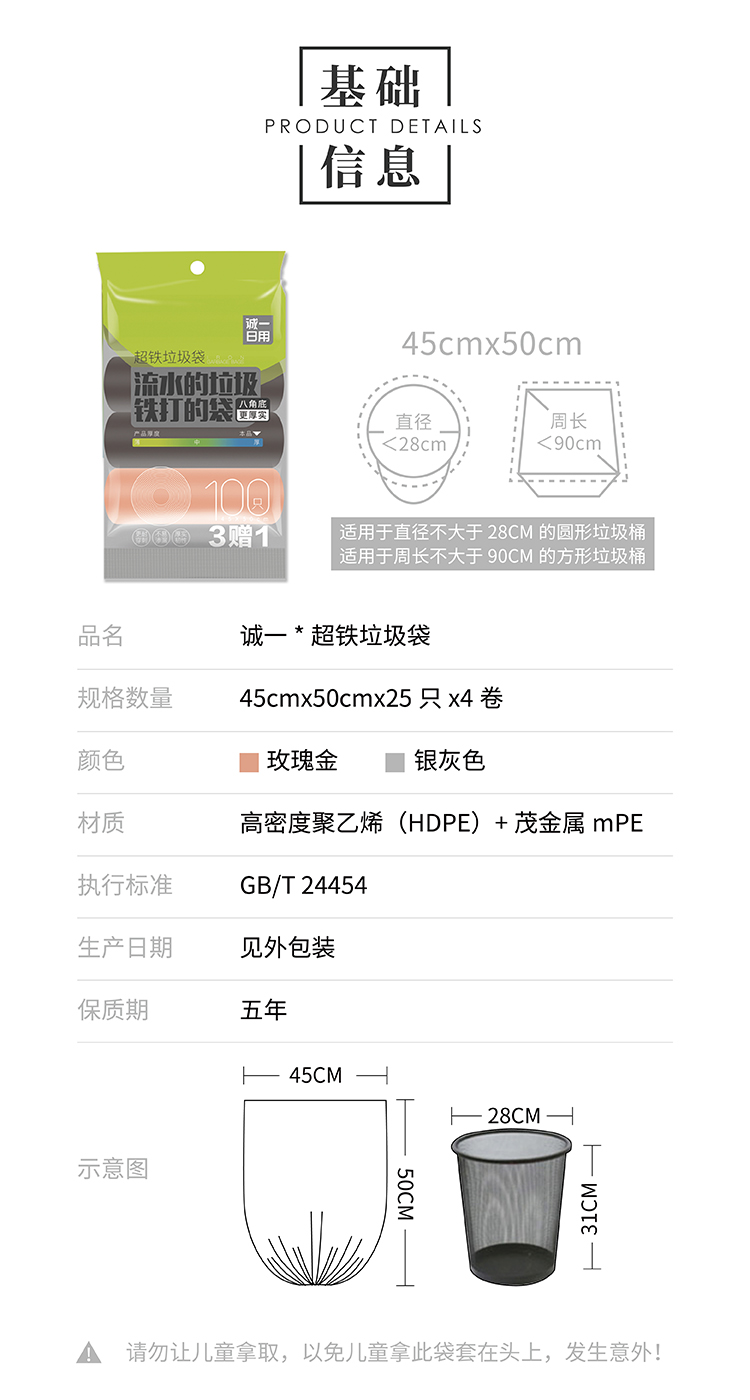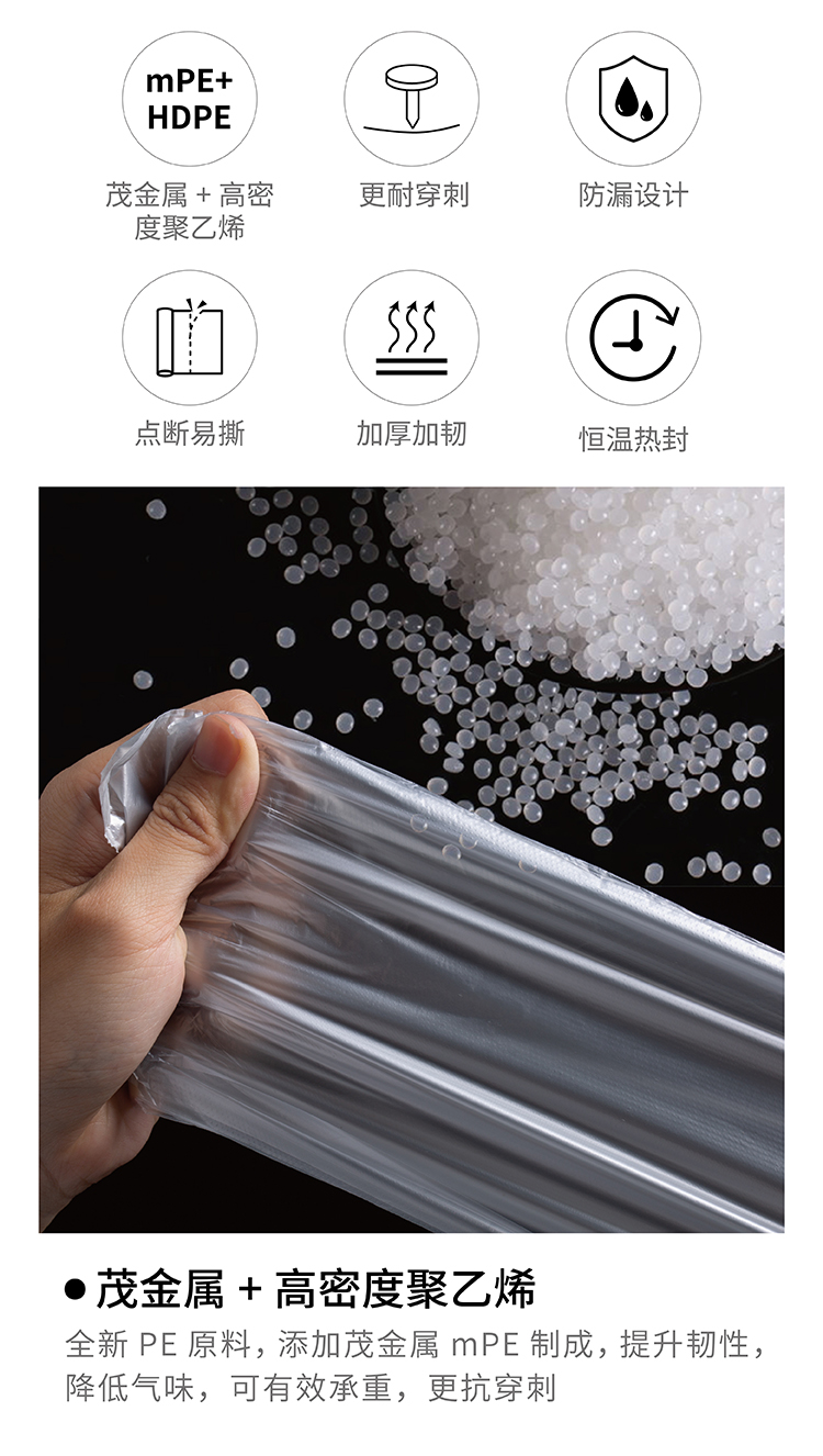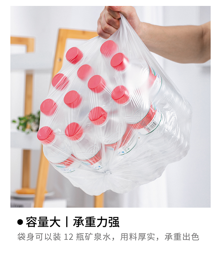 產(chǎn)品賣點: ? 全新PE原料,添加茂金屬mPE制成,提升韌性,降低氣味,可有效承重,更抗穿刺 ? 容量大,承重力強(qiáng) ? 防穿刺,不易破,可以盛裝各類家庭垃圾 ? 恒溫?zé)岱夤に,八角底,更結(jié)實耐用 ? 斷點清晰,裁剪整齊,輕松撕扯