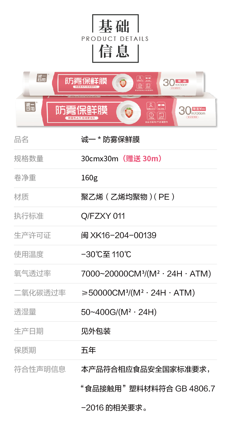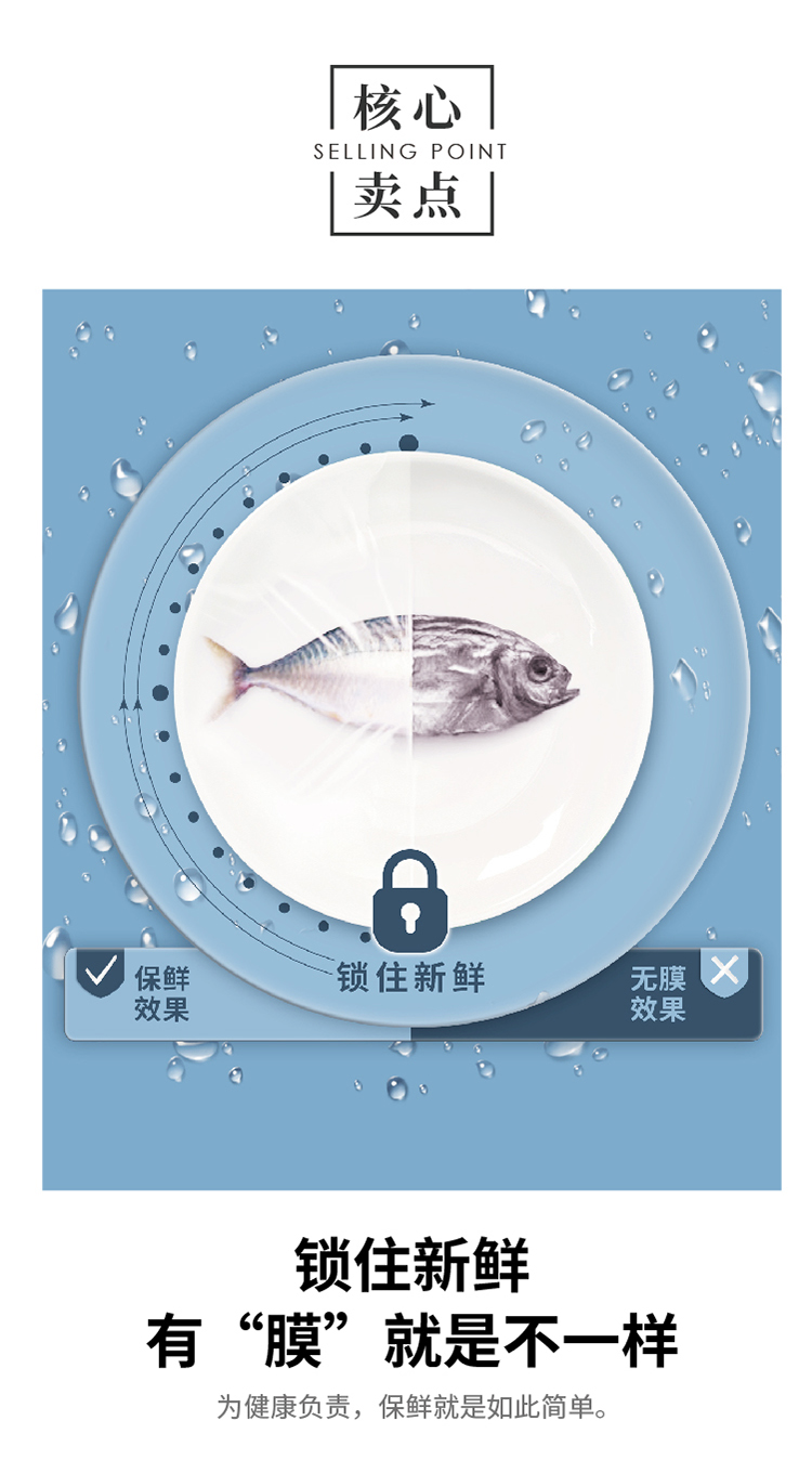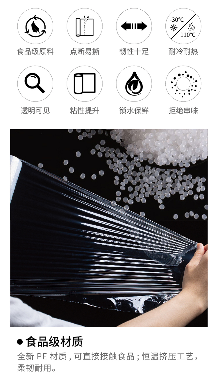 產(chǎn)品賣點(diǎn): ? 全新PE原料,可直接接觸食品,恒溫?cái)D壓工藝,柔韌耐用 ? 防霧去水汽,保鮮更佳 ? 自帶不銹鋼刀片,利落切割 ? 密封性能好,隔絕串味,“鮮”而易見 ? 耐冷-30℃,耐熱110℃