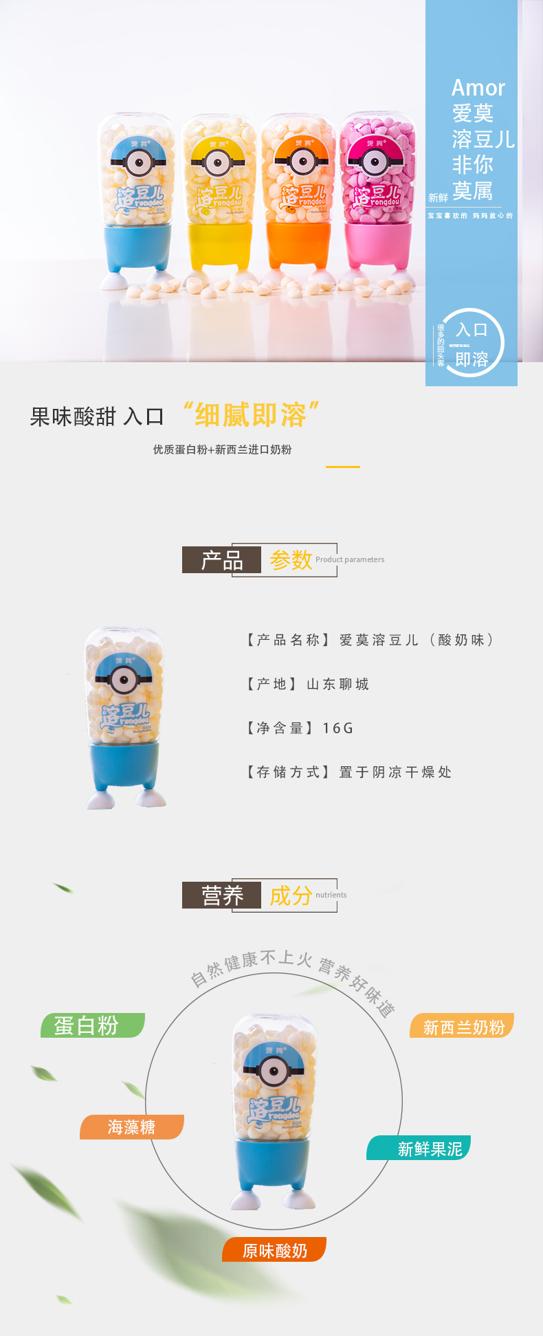 愛莫溶豆兒,入口即化,果味清甜。選用優(yōu)質(zhì)蛋白粉及進口新西蘭奶粉烘烤而成,在口味調(diào)配方面,添加生命之糖海藻糖以及新鮮上等果泥,自然醇鮮不上火。本產(chǎn)品不含香精、色素、防腐劑,另添加6種活性益生菌,對腸胃調(diào)節(jié)也能起到輔助作用,是一款新型天然健康零食。
