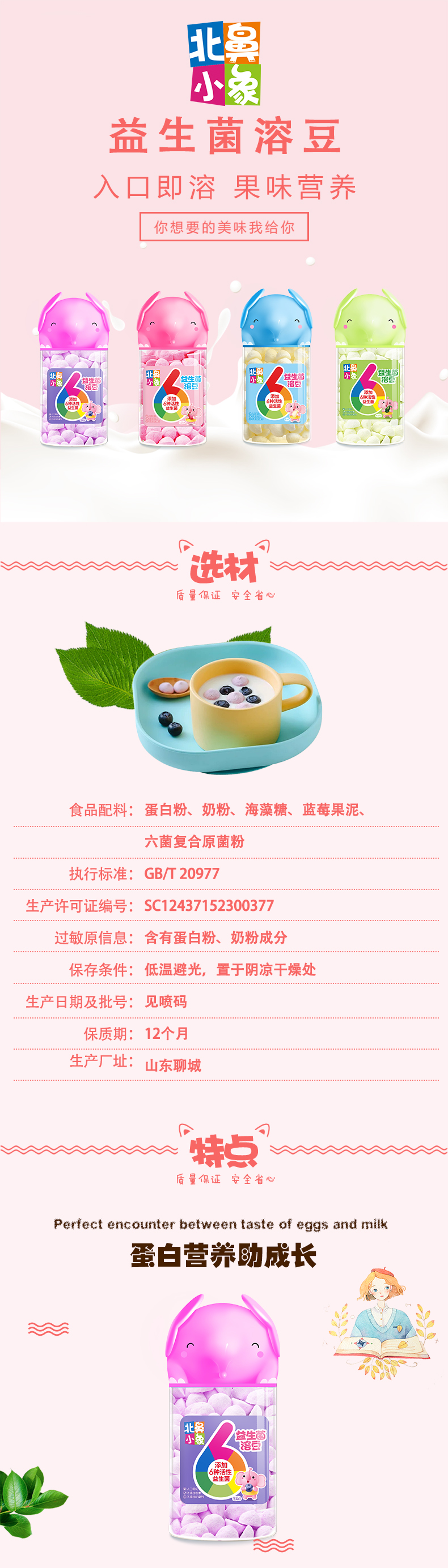 北鼻小象益生菌溶豆,入口即化,果味清甜。選用優(yōu)質(zhì)蛋白粉及進口新西蘭奶粉烘烤而成,在口味調(diào)配方面,添加生命之糖海藻糖以及新鮮上等果泥,自然醇鮮不上火。本產(chǎn)品不含香精、色素、防腐劑,另添加6種活性益生菌,對腸胃調(diào)節(jié)也能起到輔助作用,是一款新型天然健康零食。北鼻小象是愛莫溶豆品類開創(chuàng)以來作為延展創(chuàng)新開發(fā)的子品牌。此系列更大程度上增添了產(chǎn)品的萌動趣味性,外形更加吸引消費人群,同時產(chǎn)品工藝方面實現(xiàn)了傳統(tǒng)與現(xiàn)代的結(jié)合,產(chǎn)品速溶特性更明顯。
