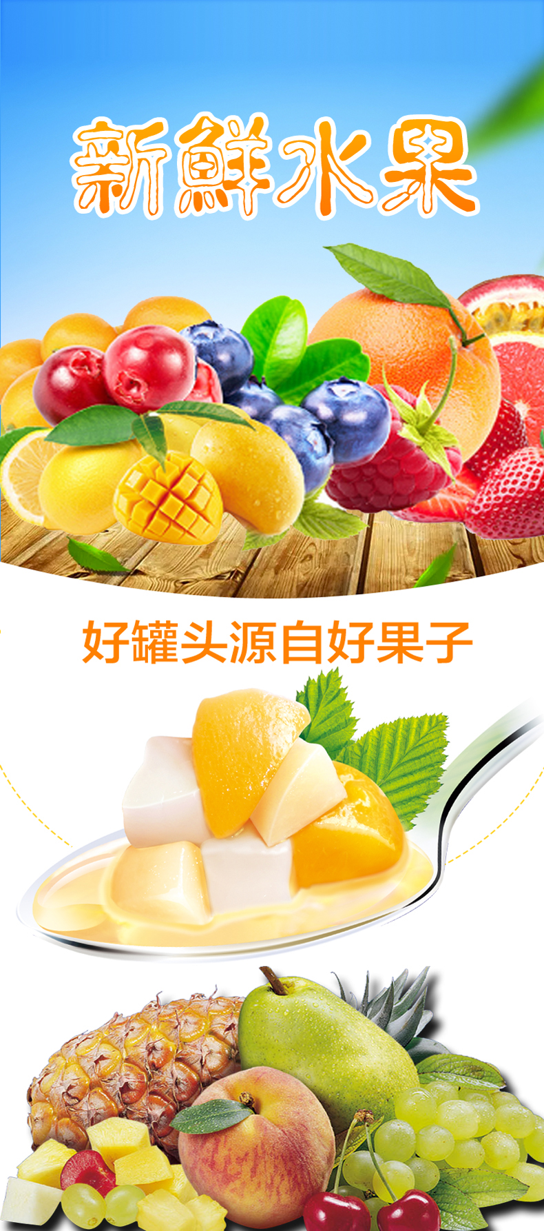 什錦水果罐頭采用多種水果制作而成,黃桃、椰果、菠蘿、櫻桃搭配制作,果肉酸甜、肉質(zhì)細(xì)膩、色澤透亮、酸甜可口。零添加產(chǎn)品,無添加劑無甜味劑老少皆宜。什錦罐頭采用巴氏殺菌處理不需要添加任何防腐劑,制作過程只用6小時(shí),完全鎖住營(yíng)養(yǎng)成分不流失,比新鮮水果更健康更安全。