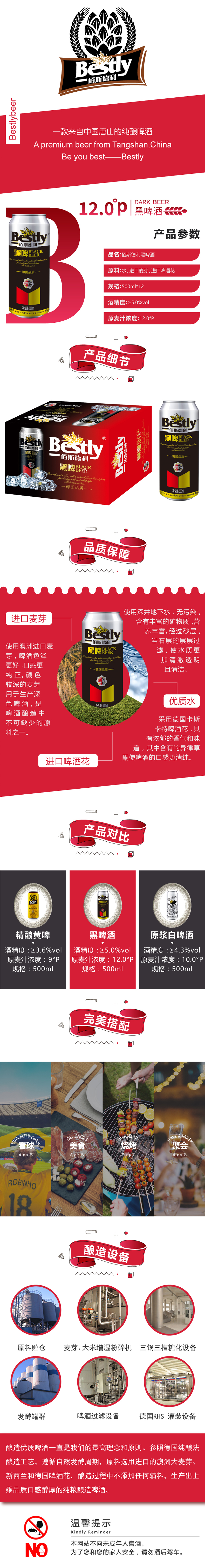 這是我們公司2009年公司投產(chǎn)后,主推的一款特色啤酒,黑色是由麥芽炒糊后形成的純天然的顏色,口感上有略苦的苦咖啡味道。參照德國純釀制法釀造,精選優(yōu)級進(jìn)口麥芽、德國進(jìn)口香型啤酒花。泡沫豐富、細(xì)膩,色澤棕黑明亮,有明顯的焦香麥芽味,口感更醇厚香濃,是原佰斯德利黑啤酒的更新?lián)Q代產(chǎn)品,主要被中高端的商務(wù)人士所青睞,是一款真正適合中國人自己口味的黑啤酒。