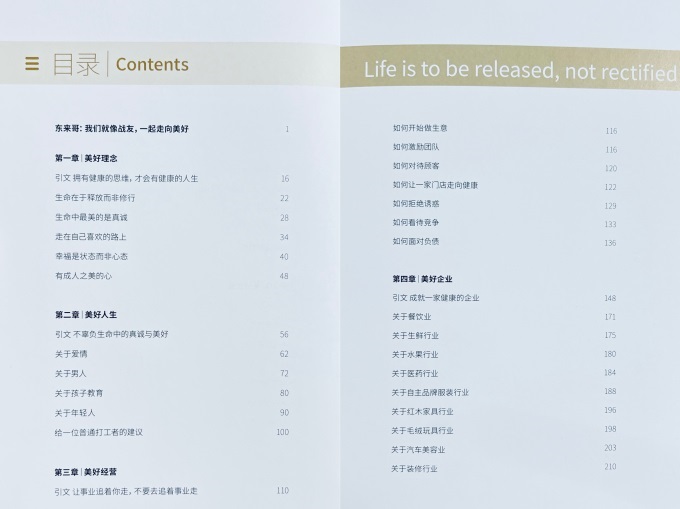該書一共214頁(yè),合計(jì)127000字,分四個(gè)篇章,第一章“美好理念”,第二章“美好人生”,第三章“美好經(jīng)營(yíng)”,第四章“美好企業(yè)”,主要內(nèi)容為近年來(lái)東來(lái)哥在抖音平臺(tái)與網(wǎng)友直播連線中的深度分享,經(jīng)系統(tǒng)梳理、歸納、提煉后整理成冊(cè),分模塊分要點(diǎn)闡述傳播美好的生活理念和科學(xué)的方式方法。