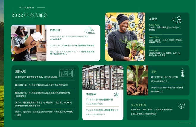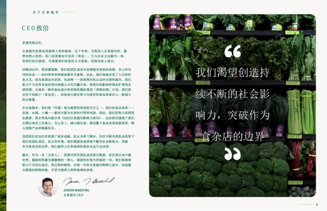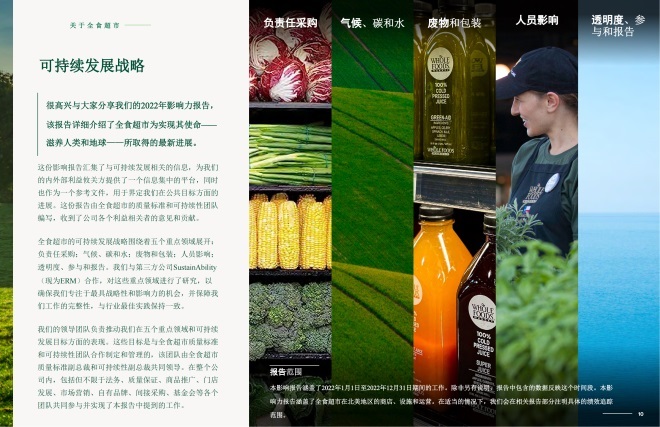 全食超市近日發(fā)布2022年度影響力報告,詳細介紹了全食超市為實現(xiàn)其使命“滋養(yǎng)人類和地球”所取得的最新進展。報告從環(huán)境保護、廢物處理、供應(yīng)鏈管理、員工福利、有機食品采購等多方面切入,突出全食持續(xù)推動食品系統(tǒng)變革的決心,以及為社會創(chuàng)造積極影響的成效。