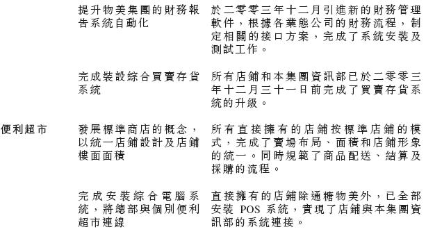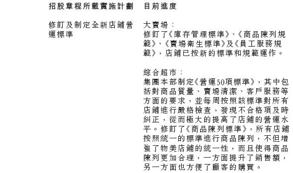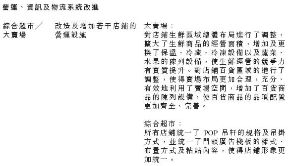 建立業(yè)態(tài)標(biāo)準(zhǔn)店鋪 報(bào)告期內(nèi),本集團(tuán)分別建立了綜合超市、便利超市樣板店鋪,統(tǒng)一了店鋪形象、營(yíng)運(yùn)管理及服務(wù)標(biāo)準(zhǔn),并在樣板店鋪的基礎(chǔ)上將成功的經(jīng)驗(yàn)在其他店鋪迅速推廣。改造后,本集團(tuán)店鋪不僅在形象上明顯提升,而且個(gè)別店鋪在銷售方面也有了明顯提高。