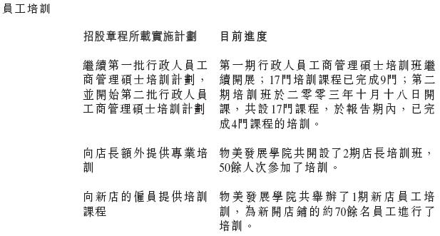 報(bào)告期內(nèi),本集團(tuán)通過(guò)物美發(fā)展學(xué)院開(kāi)辦了70期各類型培訓(xùn)班,不斷提升員工綜合素質(zhì)和專業(yè)技能。特別值得一提的是,報(bào)告期內(nèi)本集團(tuán)與中國(guó)科學(xué)院研究生院聯(lián)合開(kāi)辦了兩期「物美集團(tuán)EMBA 培訓(xùn)班」,共有100余名中、高層管理人員參加了培訓(xùn)。該類培訓(xùn)將進(jìn)一步提升物美中、高層管理團(tuán)隊(duì)的綜合管理水平。