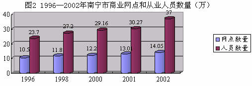 商業(yè)網(wǎng)點(diǎn)數(shù)量增加。據(jù)統(tǒng)計(jì),2002年南寧市有商業(yè)網(wǎng)點(diǎn)14.05萬個(gè),商業(yè)從業(yè)人員37萬人(近幾年增長情況見圖2),商業(yè)營業(yè)面積320萬平方米。每人擁有的商業(yè)面積從1990年前的0.24平方米增加到2002年的0.51平方米。