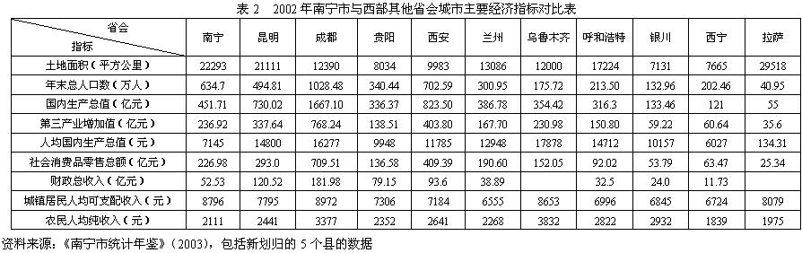 表2 2002年南寧市與西部其他省會(huì)城市主要經(jīng)濟(jì)指標(biāo)對(duì)比表