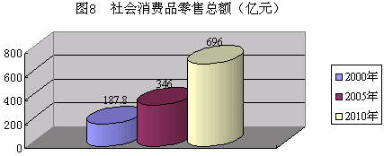 社會(huì)消費(fèi)品零售總額2005年達(dá)到346億元,比2000年增長0.8倍,年均增長13%;2010年達(dá)到696億元,比2000年增長2.7倍,2006到2010年年均增長15%。