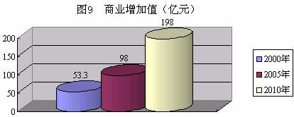 商業(yè)增加值2005年達(dá)到98億元,占服務(wù)業(yè)增加值的30%,比2000年增長0.8倍,年均增長13%;2010年達(dá)到198億元,占服務(wù)業(yè)增加值的30%,比2000年增長2.7倍,2006到2010年年增長15%。