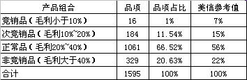 在上表中,該店共經(jīng)營商品1595種,沒有達(dá)到1800種,而且各品類比例與美信給出的參考值也相差甚遠(yuǎn)。