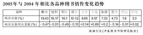 該報告還顯示,2005年由于民營圖書策劃公司收縮業(yè)務(wù),因而圖書內(nèi)容和廣告宣傳創(chuàng)新不足,暢銷書的銷售冊數(shù)下降約30%~50%(估計值)。而根據(jù)“開卷”的調(diào)查,2005年5%的暢銷品種占據(jù)了53.35%的市場份額。下游書店明顯感受到了暢銷書下降引發(fā)的客流拉動不足。