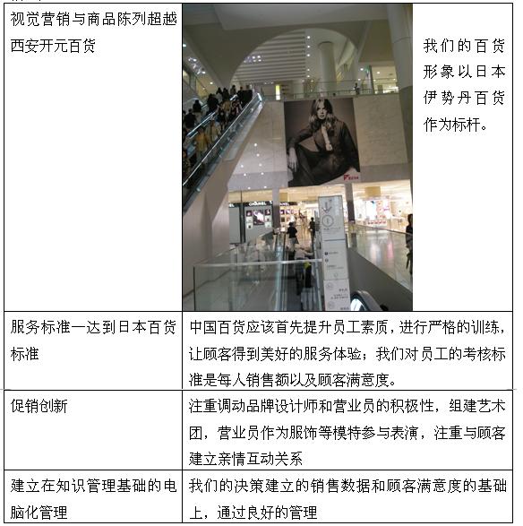 傳統(tǒng)百貨以商品為核心,通過考察學(xué)習(xí)日本百貨經(jīng)驗(yàn),我們認(rèn)為現(xiàn)代百貨以顧客體驗(yàn)與商品為核心,注重顧客在商場得到的全面體驗(yàn)。只有高標(biāo)準(zhǔn)經(jīng)營靠近縣城的百貨才能留住縣城的顧客,否則我們就難以和西安百貨競爭。我們的創(chuàng)新措施如下: