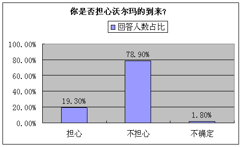 從調(diào)查結(jié)果來看,78.9%的人對沃爾瑪?shù)牡絹肀硎静粨摹T搯栴}的回答有點出乎意料。當沃爾瑪一旦計劃進入某個城市時,在很多媒體的報道中,沃爾瑪總是被稱為“外資狼”,會引發(fā)本土零售企業(yè)的恐懼或擔心。