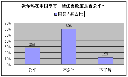 從調(diào)查結(jié)果來看,60%的業(yè)內(nèi)人士認為沃爾瑪在中國享受了優(yōu)惠待遇,覺得不公平。