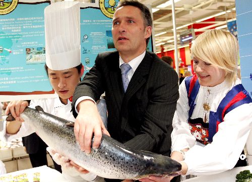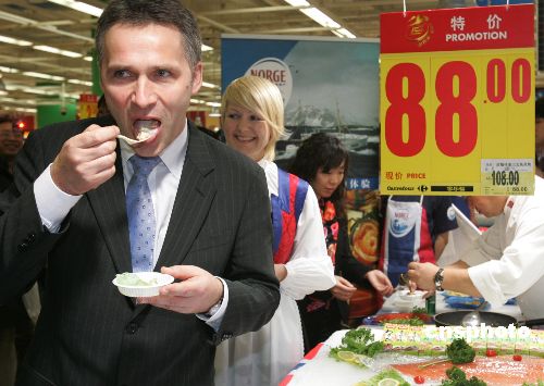 。▓D為挪威首相斯托爾滕貝格親自來(lái)到北京超市推廣三文魚(yú)。)