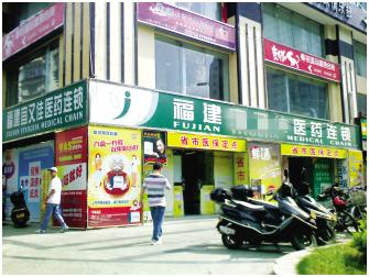 目前,零售藥店的門面設計相對簡單,色彩搭配趨同,主要表現(xiàn)為藥店門店招牌集中以綠色或藍色為主色調,店招設計單一,缺乏面向顧客的親和力;與此同時,幾乎所有零售藥店的門店形象都大同小異,缺乏與其他零售藥店區(qū)分開來的差異化營銷形象;部分藥店雖以白色為底色,其突出的文字依然是綠色或藍色(圖1)。