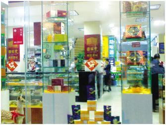 筆者曾在上海雷允上連鎖藥店的一家門店看到,其店招的色彩和設計與其櫥窗廣告渾然一體,所宣傳的品種畫面協(xié)調統(tǒng)一,產(chǎn)品噴繪質量較高,畫面意境富有美感(圖4)。而云南昆明福林堂位于步行街的旗艦店櫥窗廣告亦堪稱佳作(圖5),努力追求動感和藝術美,以新奇的設計吸引顧客,準確一些,應稱之為“櫥窗陳列”。櫥窗陳列不是簡單的產(chǎn)品陳列,更多地追求讓產(chǎn)品像藝術品一樣展示出來,產(chǎn)品要求少而精、清新悅目,尤其適合于高檔參茸、特色產(chǎn)品和精品展示。櫥窗中有梅花鹿的模型陳列,能夠展現(xiàn)藥店的形象和美譽度。櫥窗陳列中的產(chǎn)品和裝飾品排列宜疏不宜密,突出反映藥店及其經(jīng)營產(chǎn)品的特色,使顧客過目不忘。如果能讓顧客透過櫥窗陳列看到店內的全景,就能激發(fā)顧客進店的欲望,達到吸引消費者的目的。櫥窗陳列可以設計主題,并隨季節(jié)和時間進行更換。