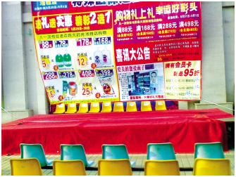 在店門外發(fā)布各種促銷活動的信息也是門店設計的一部分(圖7),包括門店產(chǎn)品買贈信息、產(chǎn)品促銷優(yōu)惠信息、會員優(yōu)惠政策等等;而大型商超的路演活動也慢慢地在一些大型藥店中興起(圖8),通過一系列主題活動,以及優(yōu)惠項目激發(fā)消費者的參與熱情,吸引顧客的眼球。路演有利于營造藥店的銷售火熱場面,塑造門店的旺銷形象。路演以及配合路演設計的宣傳展臺、促銷信息發(fā)布和活動內容同樣要遵循藥店內外的表里如一原則。