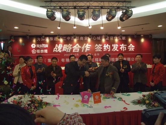 早在2004年11月初,現(xiàn)任浙江福泰隆控股集團(tuán)董事長(zhǎng)方樹(shù)安就在媒體上發(fā)表了一個(gè)論斷:“金華商貿(mào)企業(yè)到了自愿聯(lián)合,擺脫孤軍作戰(zhàn)的時(shí)候了。”這樣的斷言悄無(wú)聲息地延用到3年以后,同樣在11月初,銀泰百貨九周年集團(tuán)慶到來(lái)之前,尚是競(jìng)爭(zhēng)對(duì)手身份的金華福泰隆廣場(chǎng)的管理團(tuán)隊(duì)突然拜訪銀泰百貨福華店,進(jìn)行了氣氛融洽的溝通交流座談,并對(duì)商場(chǎng)促銷活動(dòng)及品牌引進(jìn)等一系列事宜達(dá)成了友好備忘錄。