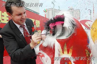 圖為歐尚集團中國區(qū)總裁蘇德華先生在開業(yè)典禮上為舞獅點睛