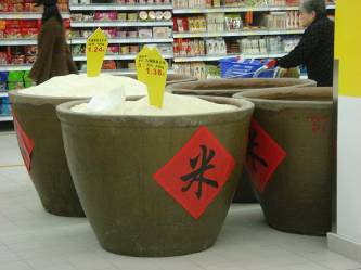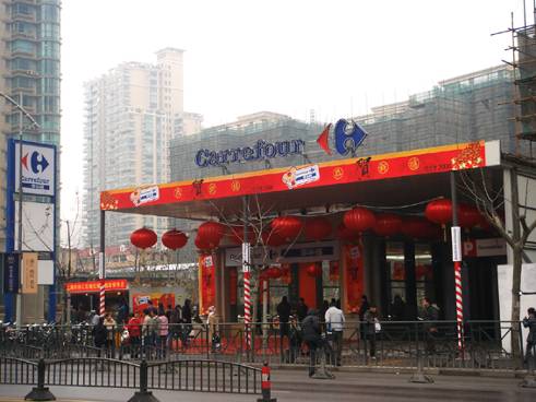 7、新開設(shè)的家樂福小型賣場的“中國味”更濃了,在陳列道具上作了不少的改變,大米銷售處用大缸來做盛米的道具是非常中國化的。焰火爆竹專設(shè)沿街的臨時售點來銷售,并不望告訴消費者購?fù)晡镌賮碣I煙花爆竹,經(jīng)營的細致可見一斑。
