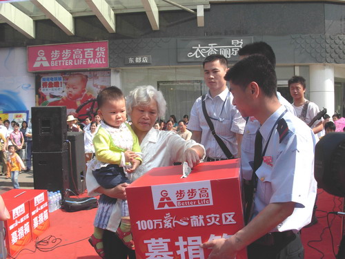聯(lián)商網消息:“活動很好,很感動!這一刻我們感覺自己都成了四川人!”5月14日,在長沙步步高東塘店,步步高黨委書記、公共事務總監(jiān)陳志強在將自己的愛心款投進捐款箱后,這樣對記者說。14日,步步高商業(yè)連鎖股份有限公司在湖南、江西87家門店同步啟動“百萬愛心獻災區(qū)”大型捐贈活動,呼吁全公司員工和廣大顧客為四川災區(qū)捐款。同時,步步高董事會決定先期拿出100萬元捐贈災區(qū)。