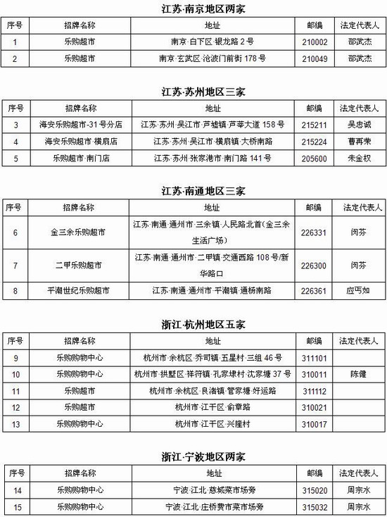 經(jīng)調(diào)查發(fā)現(xiàn),江浙地區(qū)有以下15家超市惡意冒用注冊(cè)商標(biāo)“樂(lè)購(gòu)”的標(biāo)識(shí)及樂(lè)購(gòu)超市的名義進(jìn)行非法經(jīng)營(yíng)。具體信息如下: