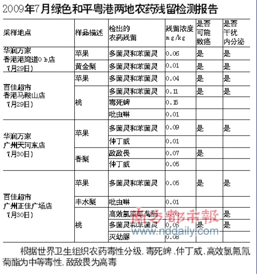 綠色和平表示,七月底在灣仔的“華潤(rùn)萬(wàn)家”和馬鞍山的“百佳”,抽驗(yàn)蘋(píng)果、梨及桃等水果,發(fā)現(xiàn)六個(gè)樣本含有可致癌和干擾內(nèi)分泌的殘余農(nóng)藥“多菌靈”和“苯菌靈”。