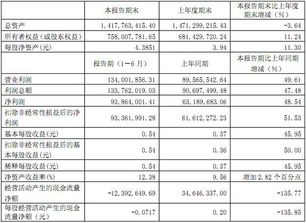 上半年公司實(shí)現(xiàn)營(yíng)業(yè)收入15.4億元,同比增長(zhǎng)10.62%,歸屬于母公司股東的凈利潤(rùn)9386萬(wàn)元,同比增長(zhǎng)48.54%。
