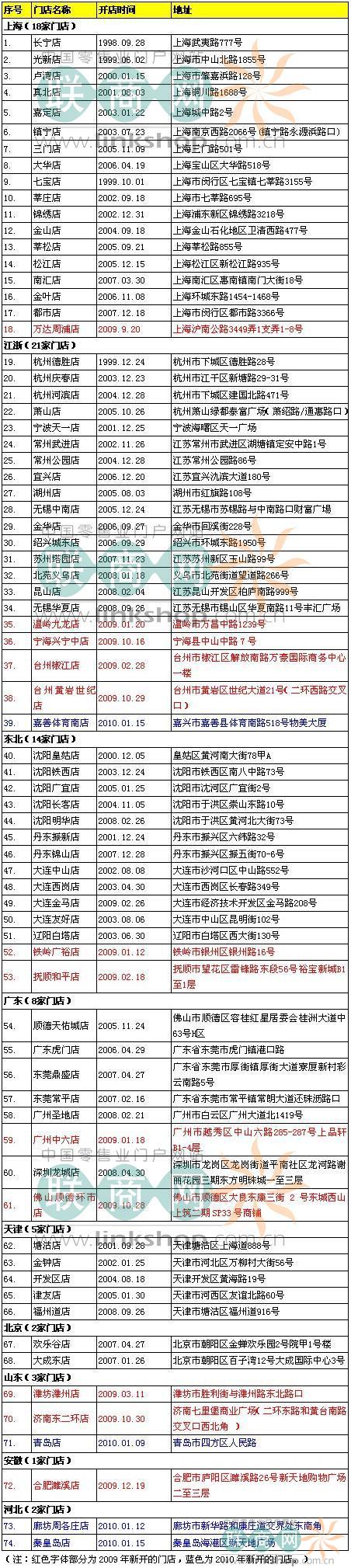 截止到2010年1月18日,TESCO樂(lè)購(gòu)在華內(nèi)地新開出4家門店。以下是詳細(xì)分布: