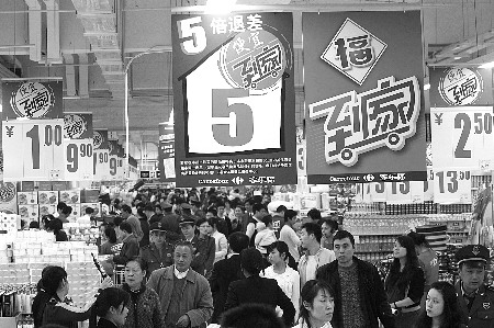 昨日,南坪上海城,新開業(yè)的家樂福超市通過對低價(jià)的宣傳引來眾多顧客。記者歐陽祖兵 攝