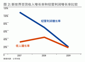 新世界百貨進(jìn)行的錯(cuò)位經(jīng)營和個(gè)性塑造其實(shí)是迫不得已之下進(jìn)行的改良,一位長期跟蹤零售百貨業(yè)的券商分析師表示,隨著國內(nèi)百貨業(yè)的發(fā)展,港資百貨店在內(nèi)地的經(jīng)營優(yōu)勢(shì)逐漸喪失,發(fā)展面臨瓶頸;而新世界百貨租用的門店很多面積都不大,不適合發(fā)展最具生命力的綜合型百貨,因此轉(zhuǎn)做特色性百貨店;但是特色性百貨店目前只是輔助型的業(yè)態(tài),主流仍是綜合型的百貨店。這可能也從一個(gè)角度解釋了新世界百貨近年來收入增長率和經(jīng)營利潤增長率雙雙下滑的原因(圖2)。