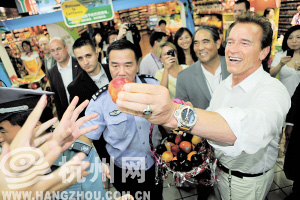 美國加利福尼亞州州長阿諾德·施瓦辛格昨天在杭州的行程有點(diǎn)小趕:下午要網(wǎng)商大會發(fā)言的他,還趁中午間隙跑到杭州世紀(jì)聯(lián)華華商店。他可不是特地來逛杭州超市的,借助自身形象來幫助加州農(nóng)民推銷農(nóng)產(chǎn)品才是其首要目的。