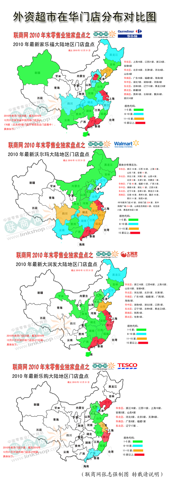 家樂福、沃爾瑪、樂購、大潤發(fā)再華門店分布對比統(tǒng)計。