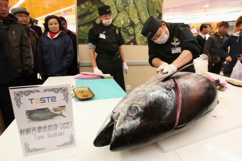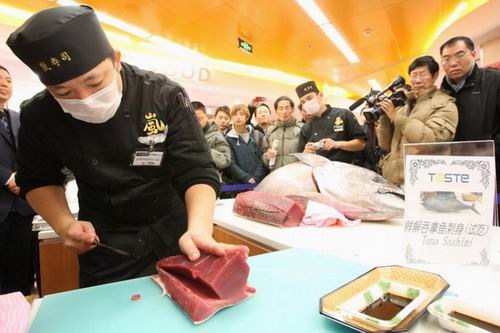 圖為廚師正在制作新鮮吞拿魚刺身并舉行現(xiàn)場(chǎng)試吃