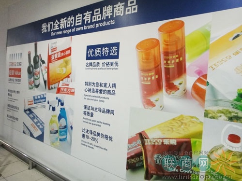商場(chǎng)入口處,包括出口過道都有大幅的廣告宣傳自己的自有產(chǎn)品,并附有文字說明:“我們?nèi)碌淖杂衅放粕唐?品質(zhì)保證 價(jià)格實(shí)惠 精選百余種日常所需商品 保證商品優(yōu)質(zhì)安全 保證全年低價(jià)供應(yīng)”。