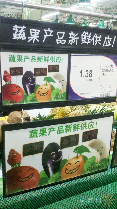 另外從09年5月份開始樂購自有品牌蔬菜上市。樂購很顯然也極其重視這一塊,蔬菜生鮮區(qū)的廣告宣傳牌隨處可見。