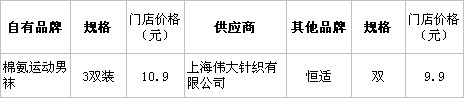 分析:大拇指“3雙裝”運(yùn)動(dòng)男襪與恒適“一雙裝”相比較,價(jià)格雖高出1塊,但是量卻高出2雙,得:大潤(rùn)發(fā)自有產(chǎn)品的性價(jià)比很高。