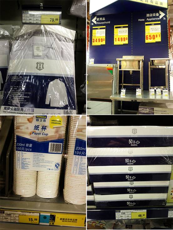 在商品選購之時,如果是麥德龍的自有產(chǎn)品,將會集中擺放,會貼上各個自有品牌的標識,客戶可以很容易的認出哪些是自有品牌。