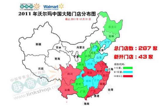 沃爾瑪2011年中國內(nèi)地新開門店43家,其中浙江3家、江蘇5家、上海4家、安徽4家、河南1家、廣東4家、云南1家、四川3家、湖北4家、北京1家、山東1家、山西1家、遼寧1家、福建5家、河北2家、吉林1家、江西1家、湖南1家。詳見下圖: