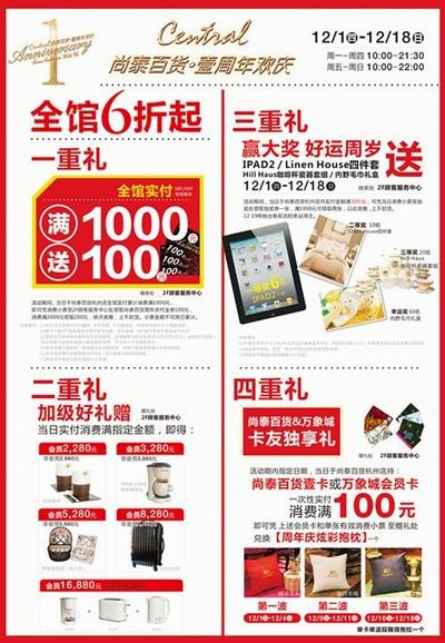 2011年12月1日至18日,杭州尚泰百貨開展了長達18天的店慶促銷活動,18天的活動期,每天都有一些品牌做品牌日,在品牌日購買此品牌商品,即可享受會員服飾10倍積分,化妝品20倍積分。