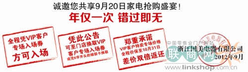 9月20日當(dāng)天,憑VIP客戶專場入場券入店即享一步到位價(jià),還可額外再享最高200元優(yōu)惠及超值豪禮,入場券名額有限,搶到即賺到。瘋狂搶購請(qǐng)鎖定9月20日國美電器。