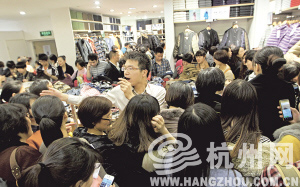 每日商報頭版:杭州武林銀泰店現(xiàn)場熱度高漲 來源: 聯(lián)商網(wǎng) 2012-11-17 16:39 昨天傍晚,杭州武林銀泰店5樓某品牌店門口工作人員正擠在人群里用擴音器現(xiàn)場維持秩序。昨天是銀泰一年一度的店慶日,雖然每年都在搞促銷,“滿就減,滿就送”的廣告也早已是老百姓熟悉的噱頭?蛇是有不少市民蜂擁而至前來挑選覬覦許久的商品。 。咳丈虉 記者 詹逾 攝)