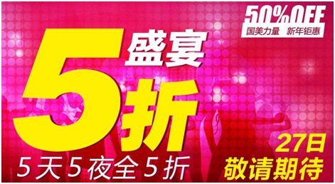 在“圣誕狂歡惠”整體銷售再破新高之際,國美在線持續(xù)發(fā)力2013元旦佳節(jié)。記者從國美在線獲悉,由國美在線領(lǐng)跑各大電商的“跨年慶典5折盛宴”于12月27日提前盛大啟幕。屆時,包括3C數(shù)碼、 廚衛(wèi)生活、百貨、圖書等近千款暢銷商品在國美底價的基礎(chǔ)上再打5折銷售,帶給消費者2012年最后一次低價盛宴。