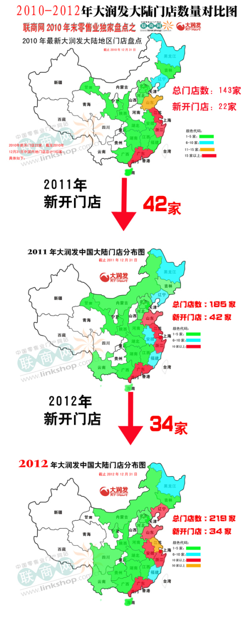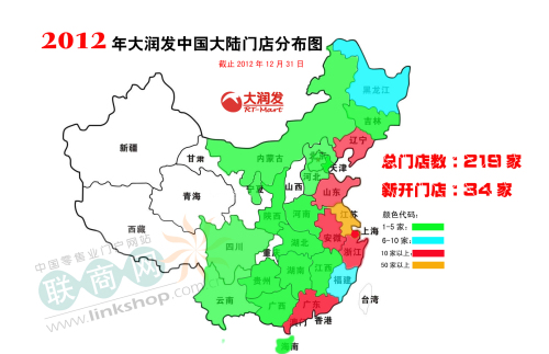據(jù)聯(lián)商網(wǎng)統(tǒng)計,2012年1月1日~2012年12月31日,大潤發(fā)在華新開34家門店,首次進入貴州省。