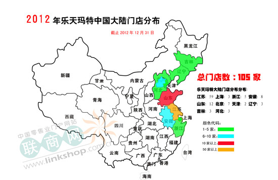 聯(lián)商網(wǎng)編輯根據(jù)綜合資料整理,截止2012年12月31日,樂天瑪特在華門店總數(shù)達(dá)105家。以下是具體門店分布明細(xì)表:(注:紅色部分為樂天瑪特2012年新開業(yè)的門店,藍(lán)色部分為樂天瑪特2012年在華停業(yè)或者改造的門店)