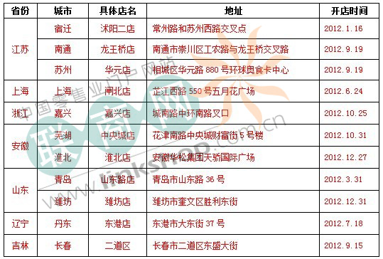 聯(lián)商網(wǎng)編輯根據(jù)企業(yè)官網(wǎng)、媒體報(bào)道等整理,2012年樂天瑪特在華新開門店11家。具體分布如下:
