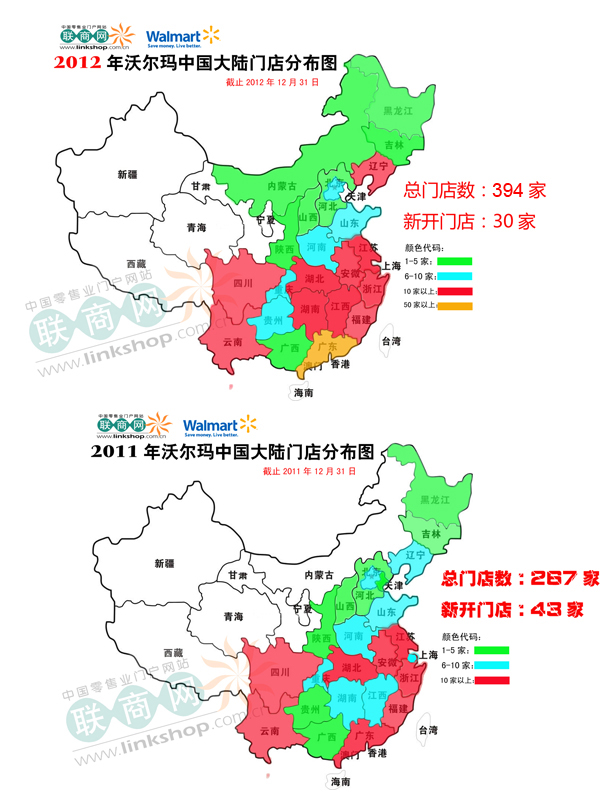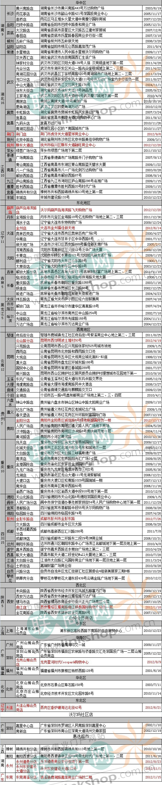 截止2012年12月31日,沃爾瑪2012年在華新開店30家,其中:廣東5家,河南3家,江蘇3家,遼寧3家,安徽2家,廣西2家,湖南2家,湖北1家,河北1家,陜西1家,福建1家,貴州1家,江西1家,內(nèi)蒙古1家,上海1家,四川1家,云南1家。具體分布如下: