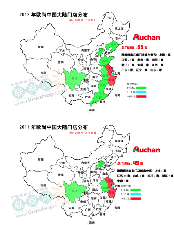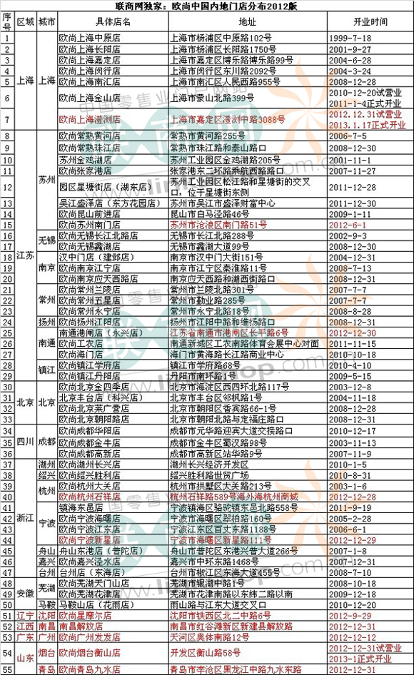 一、 據聯(lián)商網編輯統(tǒng)計,歐尚在華新開門店為10家,門店總數(shù)達55家。截止到2012年12月31日,門店總數(shù)達55家。